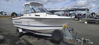 This is a very clean 20.5′ walk-around ready to fish and crab. Repowered with a 175hp Suzuki, alongside a 8hp Tohatsu kicker, this boat is CLEAN. It has a 9″ Simrad screen/transducer. Trailer is in good shape and well maintained. Everything seems to work well and has been taken care of. The main seats have been replaced, with originals included. All interior cuddy cushions are clean and well cared for. Come take a look!