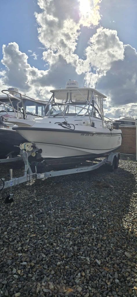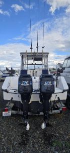 For sale on consignment at Boat Country in Everett, Washington. For sale at $49,997. This 2000 Boston Whaler Conquest 23 is a single owner boat that has been well maintained and stored inside its entire life, in a dedicated boat house. Initial inspection shows everything to be in working order. Initial sea trial showed 43mph at 5600rpm, essentially optimal performance for the time it was produced. Powered by twin Mercury 150hp Optimax engines, with 381.6hrs on the port side motor, and 371.8hrs on the starboard side motor. The boat is equipped with a Lowrance HDS 12 screen with transducer, vhf marine radio, and radar. It is one of the unique single owner survivors, and ready for its next owner