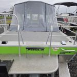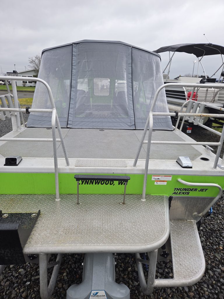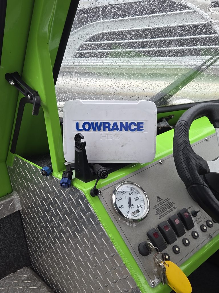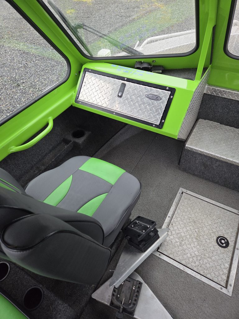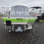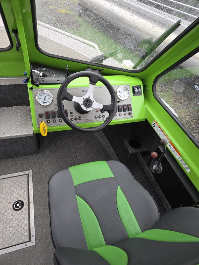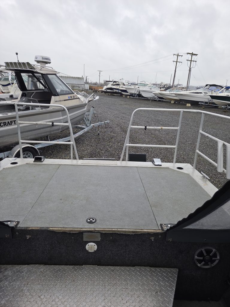 Fishing Equipment: Comes with welded 32″ wrap-around stern rails, six welded rod holders, and a locking transom fish box with a diamond lid.