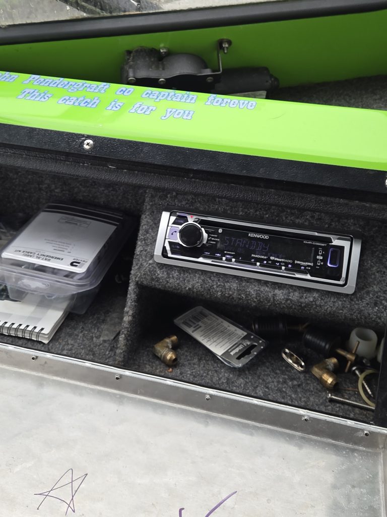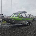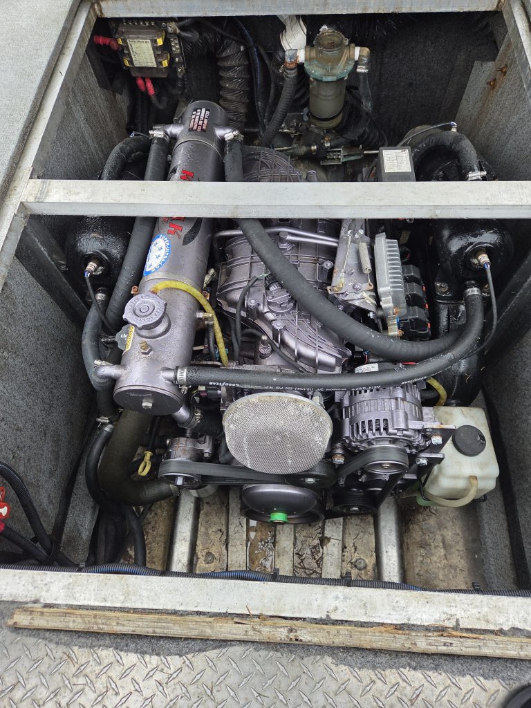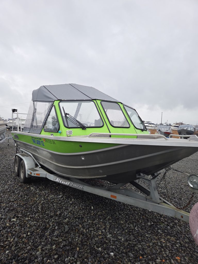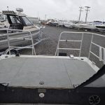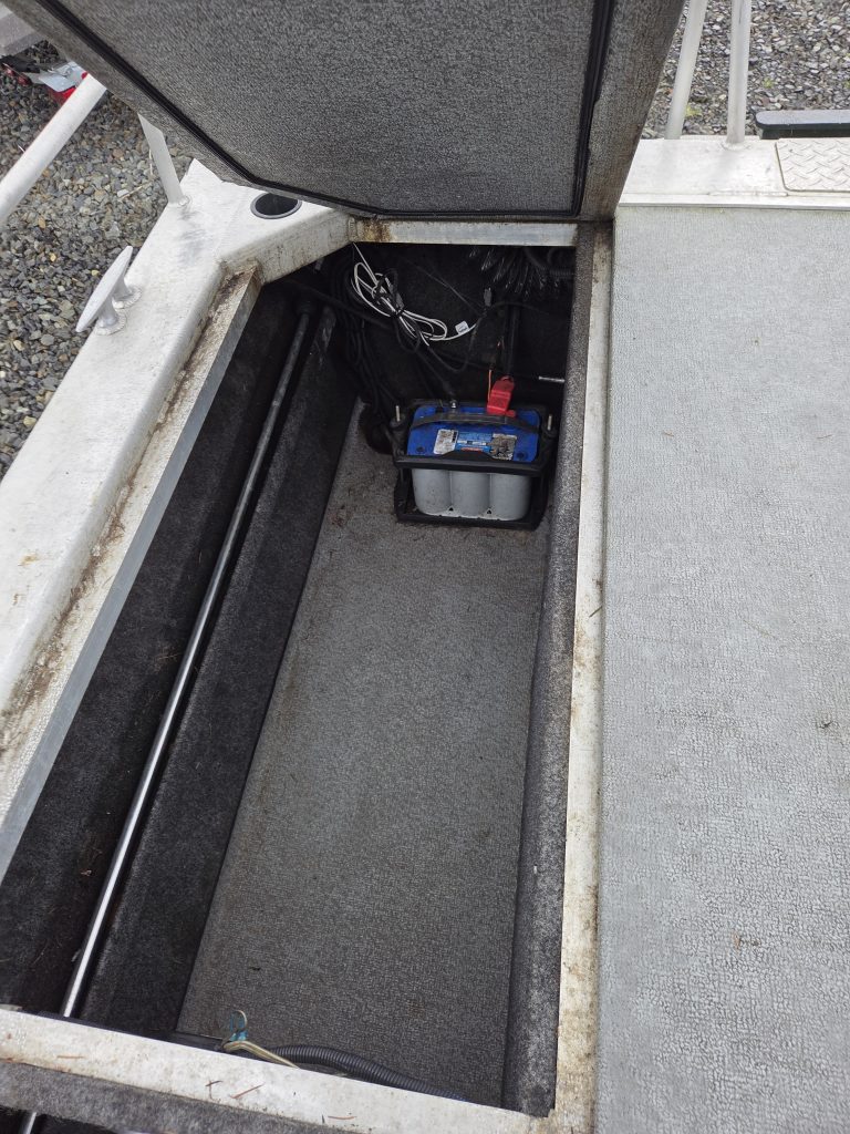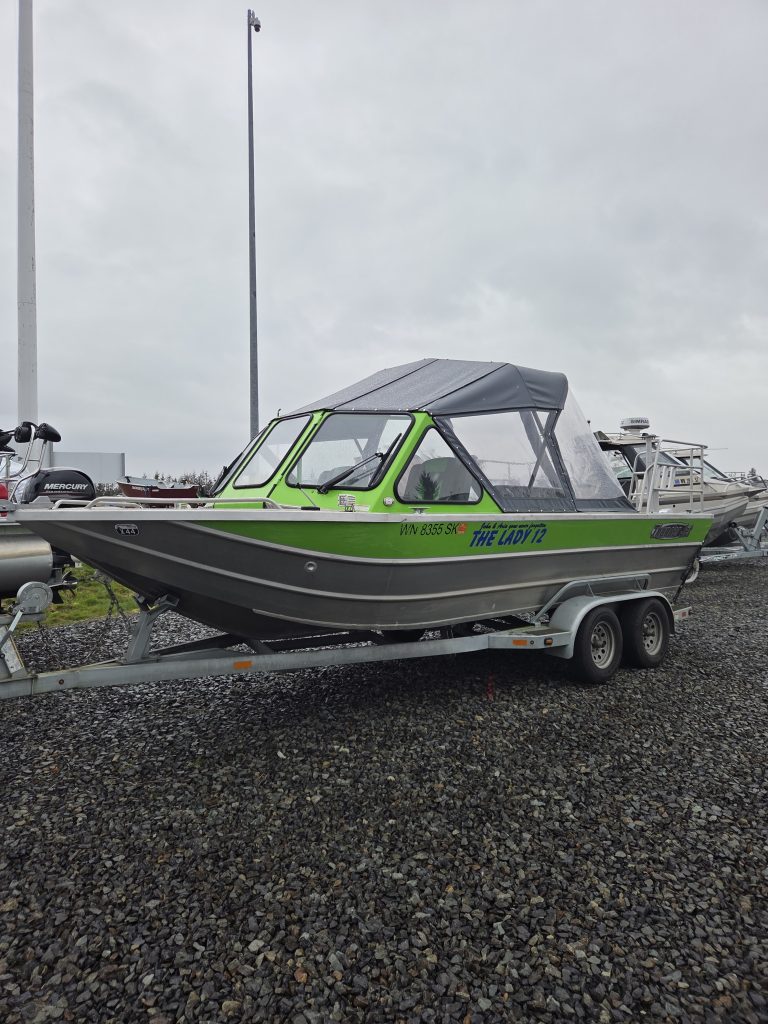 Fishing Equipment: Comes with welded 32″ wrap-around stern rails, six welded rod holders, and a locking transom fish box with a diamond lid.