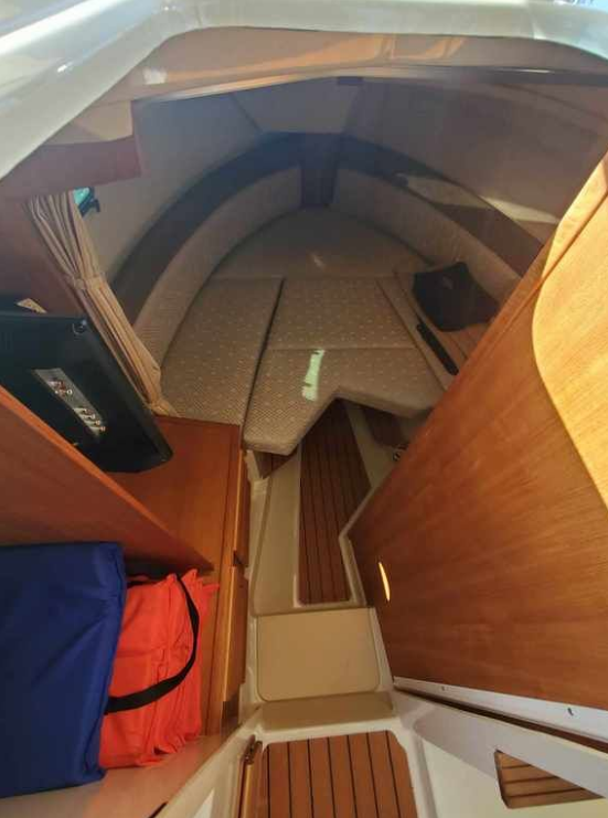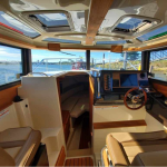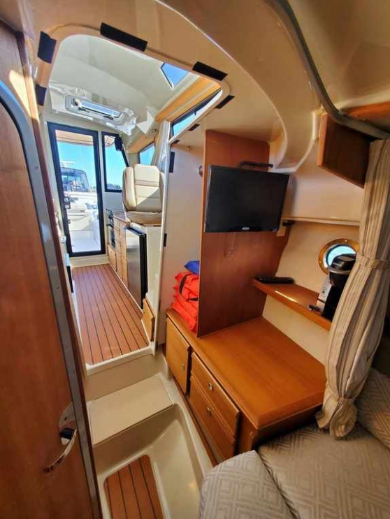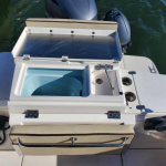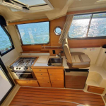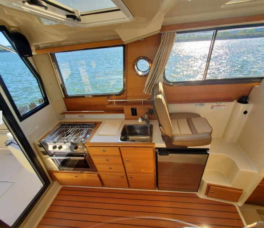 The curved front windshield and overhead glass atrium provide beautiful 360 degree views and generous light throughout the salon. Open the aft glass bulkhead in tandem with any of the hatches, windows, or port lights to deliver a fresh breeze throughout the cabin. Chefs will be delighted to cook in the full galley complete with a propane stove and oven with broiler, or to simply grill on the removable electric Kenyon grill. When taking in a gorgeous sunset, you and your guests can enjoy the view from the spacious cockpit or from the new double lounge seat on the bow of the R-27.