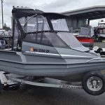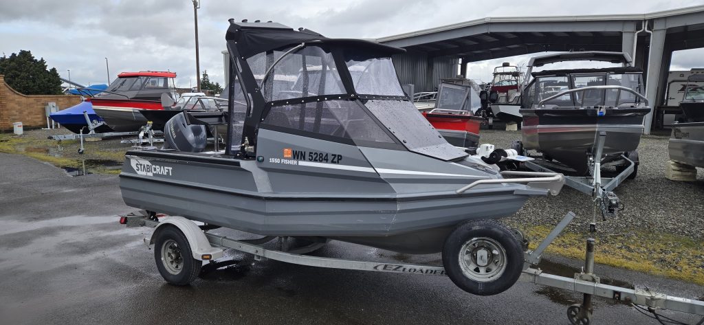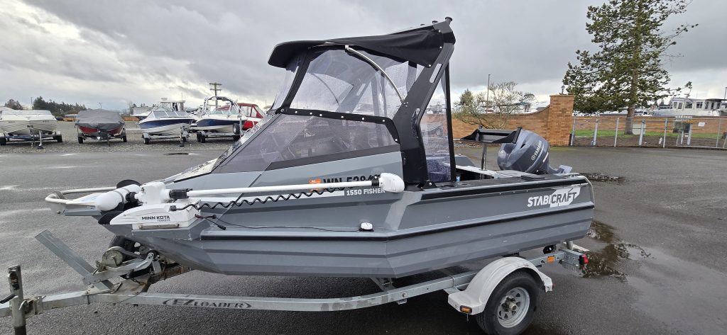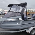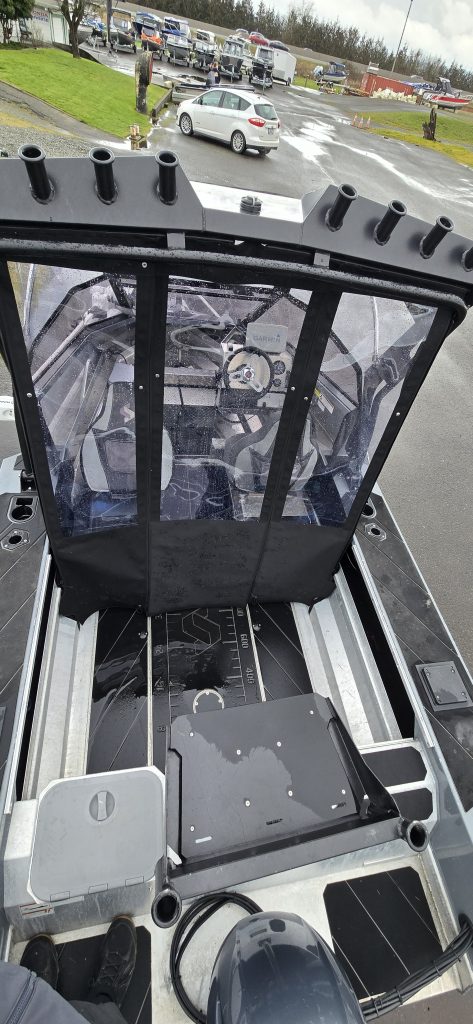 The bimini top framework has been entirely replaced with stainless steel bows and rails, and all of the canvas has been replaced with heavy duty fabric and front/side/rear curtains capable of towing at highway speeds. It also has a rear slant back canvas for storing outside or mooring.